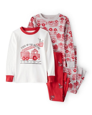 Firetruck Print 100% Cotton Long-Sleeve 4-Piece Pajamas - Red/White