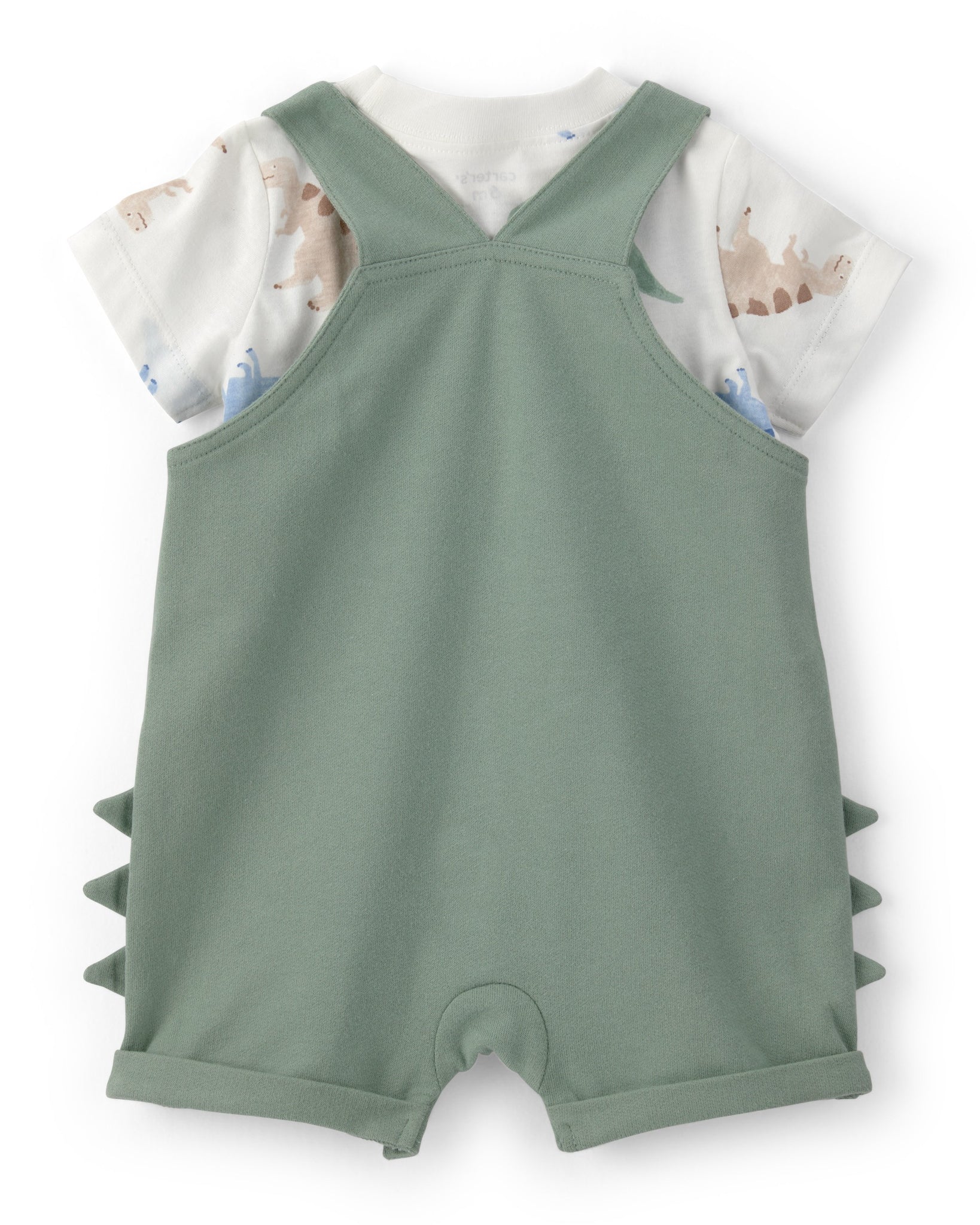 Get ready for adventure with the perfect outfit for your little explorer. This 2-piece set combines fun and functionality. Made from soft jersey and carbonized French terry; this set ensures comfort all day long. The white tee features a playful dino print that sparks imagination; while the green shortall boasts a convenient kanga pocket for tiny treasures. Stylish spikes along the legs add a dash of flair; making it ideal for playdates and casual outings. Dress your little one in this delightful ensemble and watch them conquer their world with confidence.