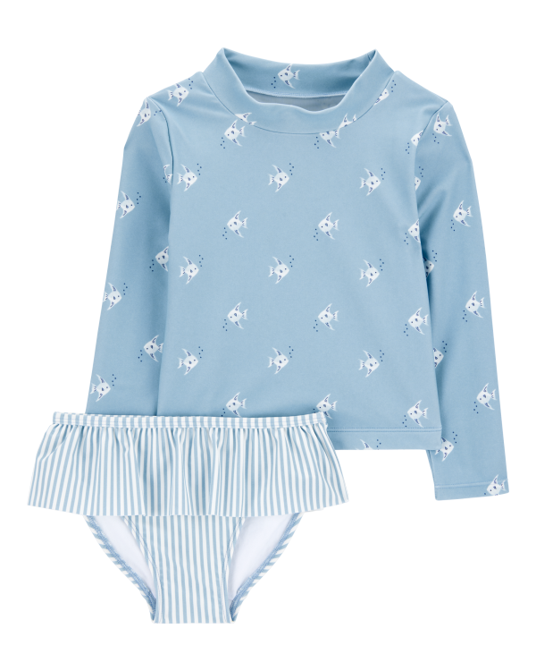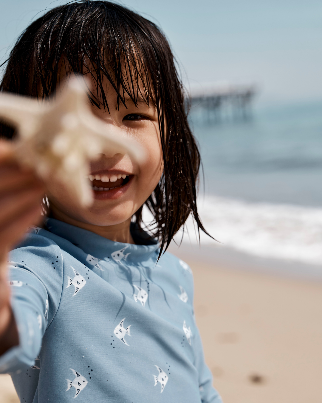 This rashguard set is UPF 50+ sun protected and designed with a quick-drying fabric to keep her cool all season long. Allover fish make this set extra fun.