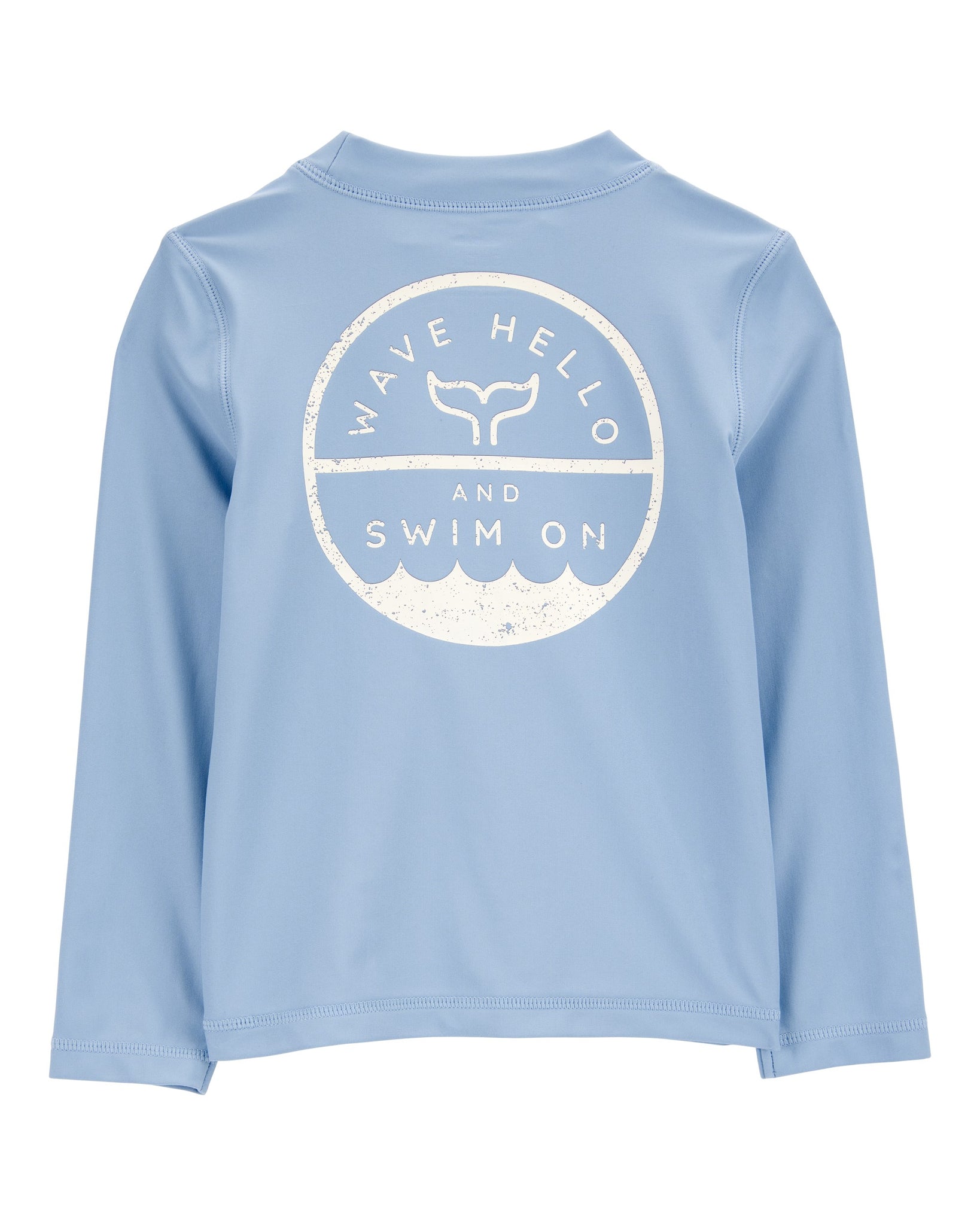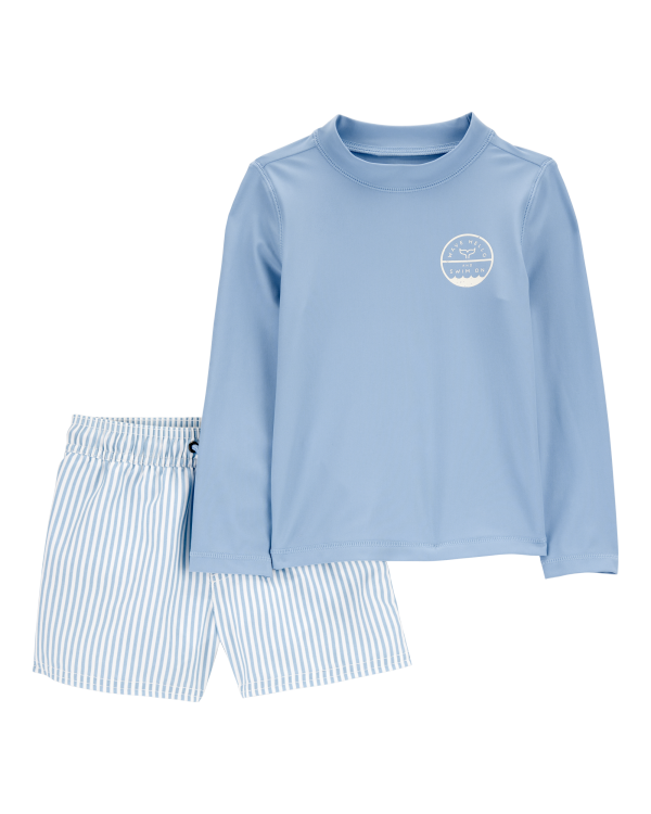 Hes ready for sunny days in this long sleeve rashguard and orange print swim trunks. Both complete with UPF 50+ sun protection and a fan favorite year after year.