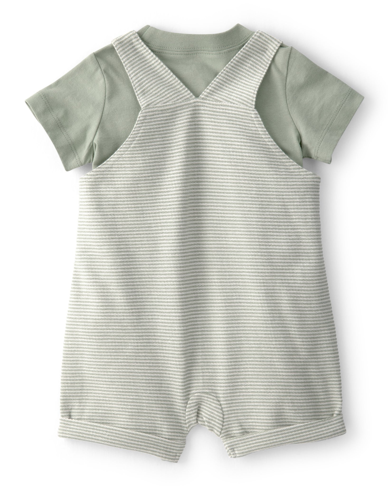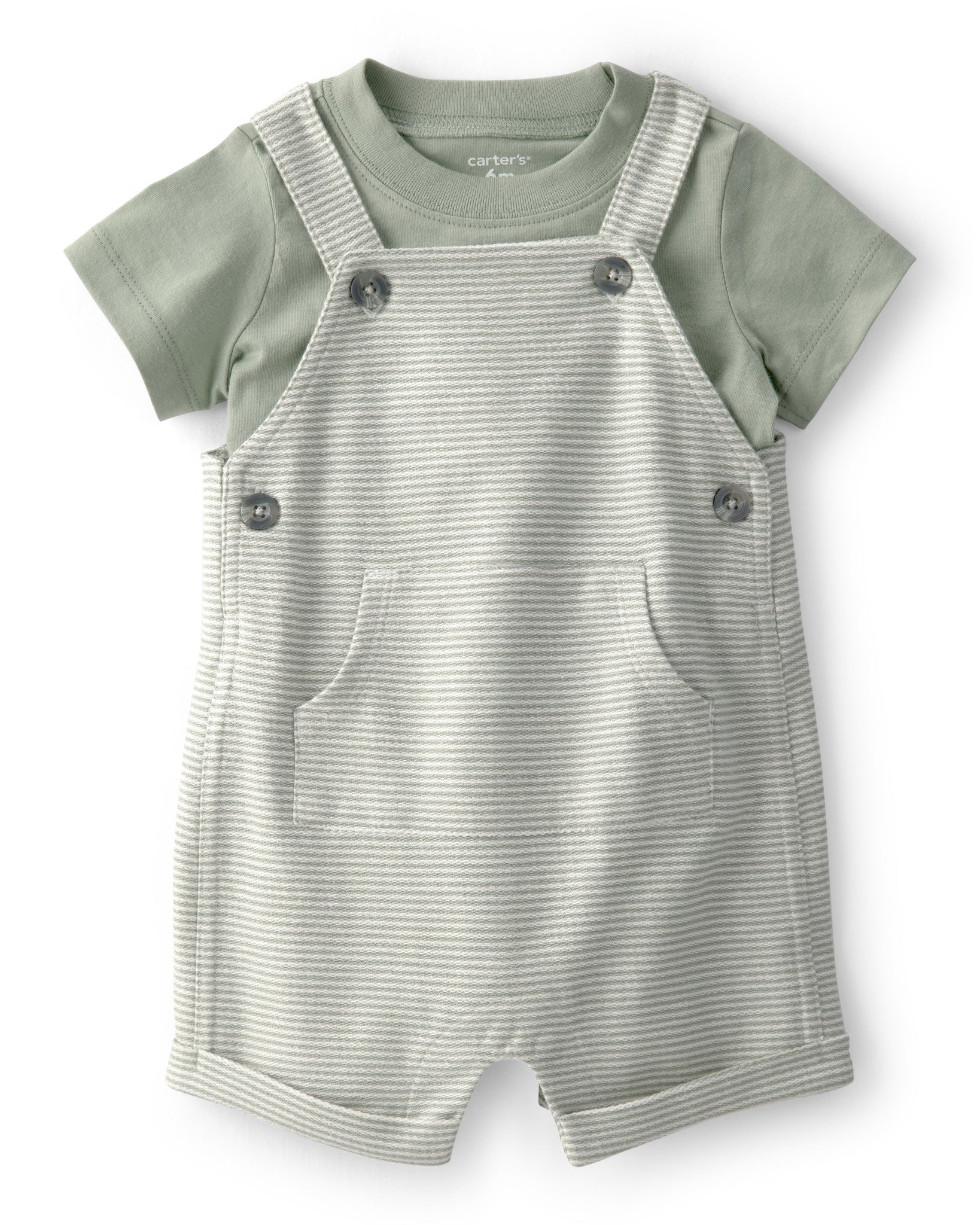 Dress your little one in adorable comfort with this charming 2-piece set! Featuring a soft; striped shortall with a handy front pocket and a coordinating tee; this outfit is perfect for playdates; outings; or everyday wear. Designed with functional buttons for easy changes; it’s as practical as it is cute.