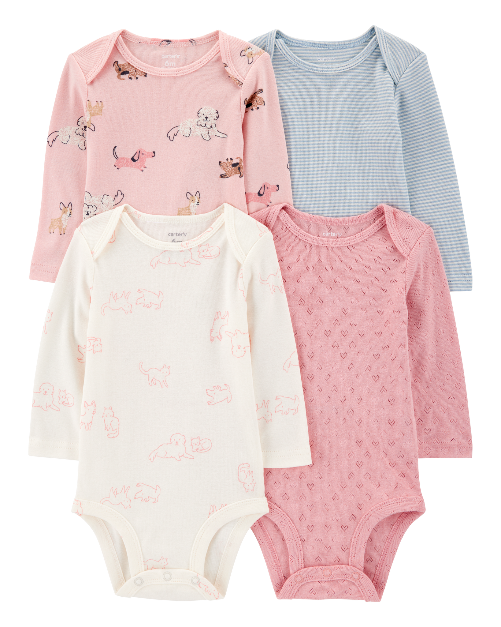 This 4-pack of baby girl long sleeve bodysuits features overlap shoulders for effortless dressing. Made from soft fabric; these bodysuits offer a snug and comfortable fit; perfect for everyday wear. Combining value; durability; and sweetness; this set is a must-have for any parent looking for essentials.