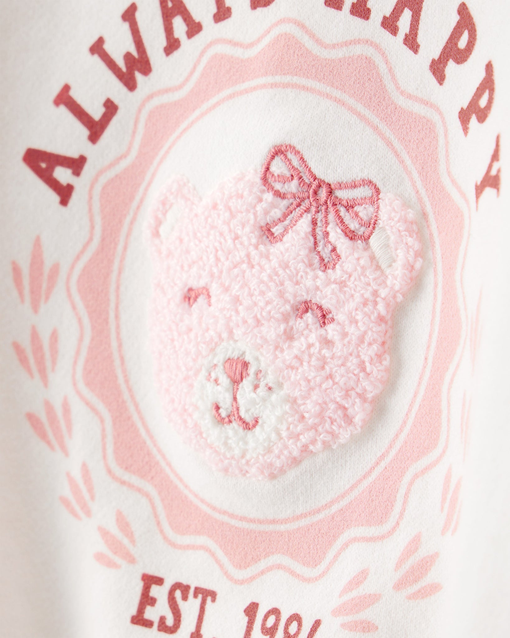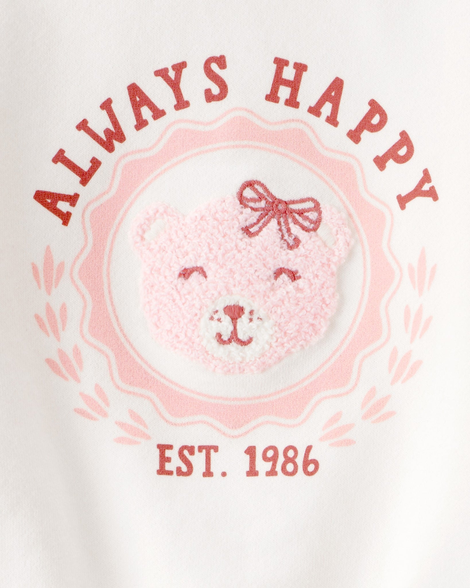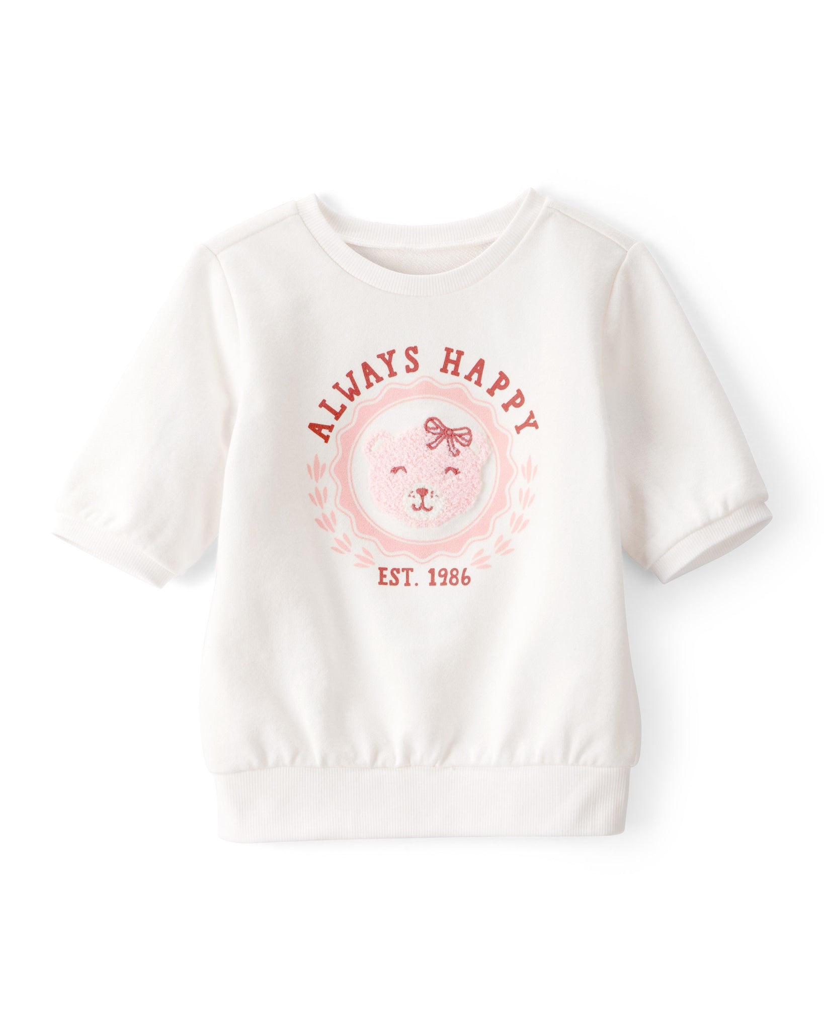 This tee-meets-sweatshirt is all smiles-literally. With a fuzzy bear face; embroidery; and “Always Happy” graphic; it brings cozy comfort and personality to every outfit. The short sleeve design makes layering easier; and the relaxed fit keeps things