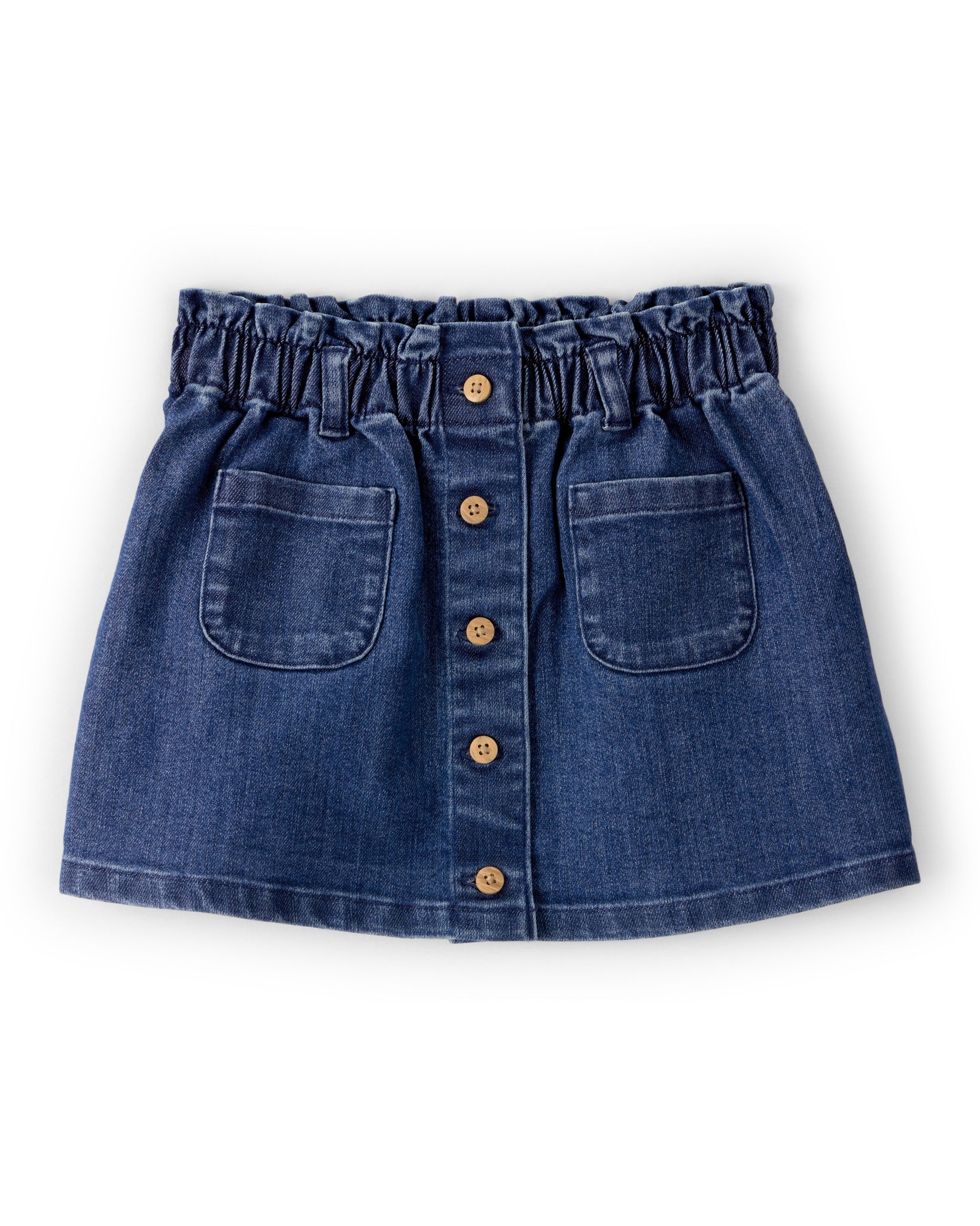 The classic denim skirt gets a kid-friendly upgrade. This dark blue A-line style features patch pockets; a gathered elastic waistband; and wood-style buttons down the front-just enough detail for a little personality. Easy to mix into any outfit; thi
