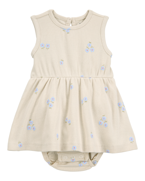 Looks like a dress but built like a bodysuit; what could be better? Complete with allover floral and easy snaps at the legs for quick changes; this sunsuit gets baby ready in no time!