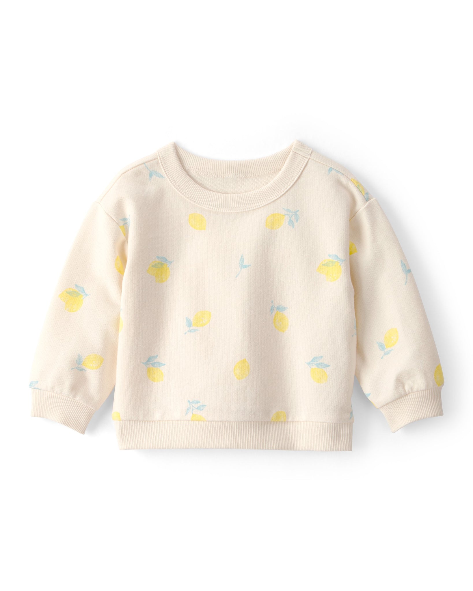Brighten up your little one’s wardrobe with this delightful pullover sweatshirt. Made from soft; carbonized French terry; it promises all-day comfort for your baby girl. The charming ivory fabric features a playful lemon print; perfect for casual outings or cozy days at home. Parents will appreciate the easy pull-on style; making dressing a breeze; even on the busiest mornings. This versatile piece is ideal for layering as the seasons change. With its stylish design and practical functionality; this sweatshirt is a must-have for every little wardrobe. Trust in quality that keeps your child comfy and cute.