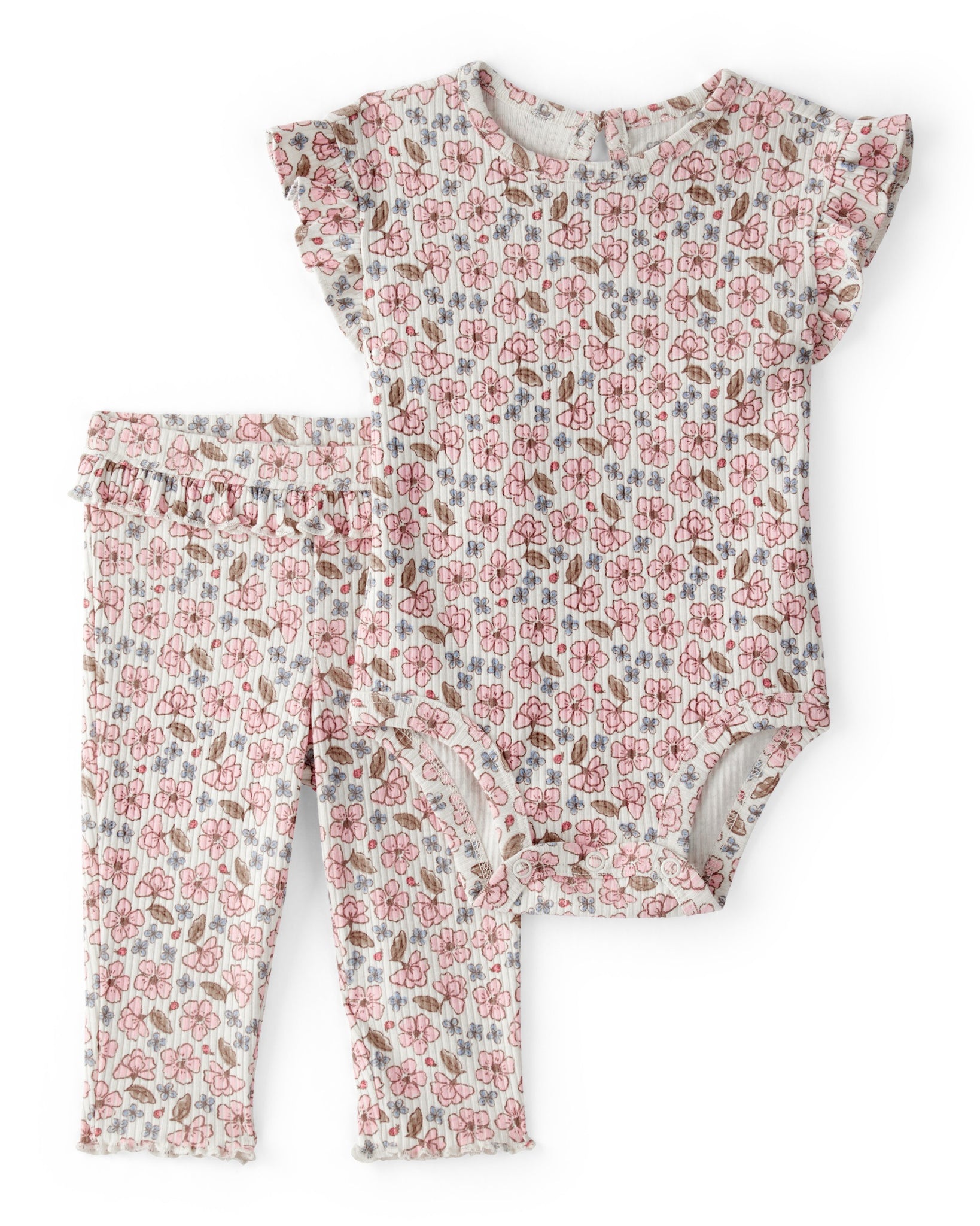 Dress your little one in effortless style with the Baby Girl Ruffle Floral Bodysuit & Pant Set. Made from soft; breathable cotton; this two-piece set ensures all-day comfort for your busy baby. The charming floral pattern adds a touch of cheer; perfect for casual outings or playdates. Parents will appreciate the easy snap closure on the bodysuit for quick changes; while the stretchy pants allow for unhindered movement. With ruffle details that elevate the look; this set combines practicality and fashion seamlessly. Trust in a brand that understands what little ones need to feel cozy and look great.