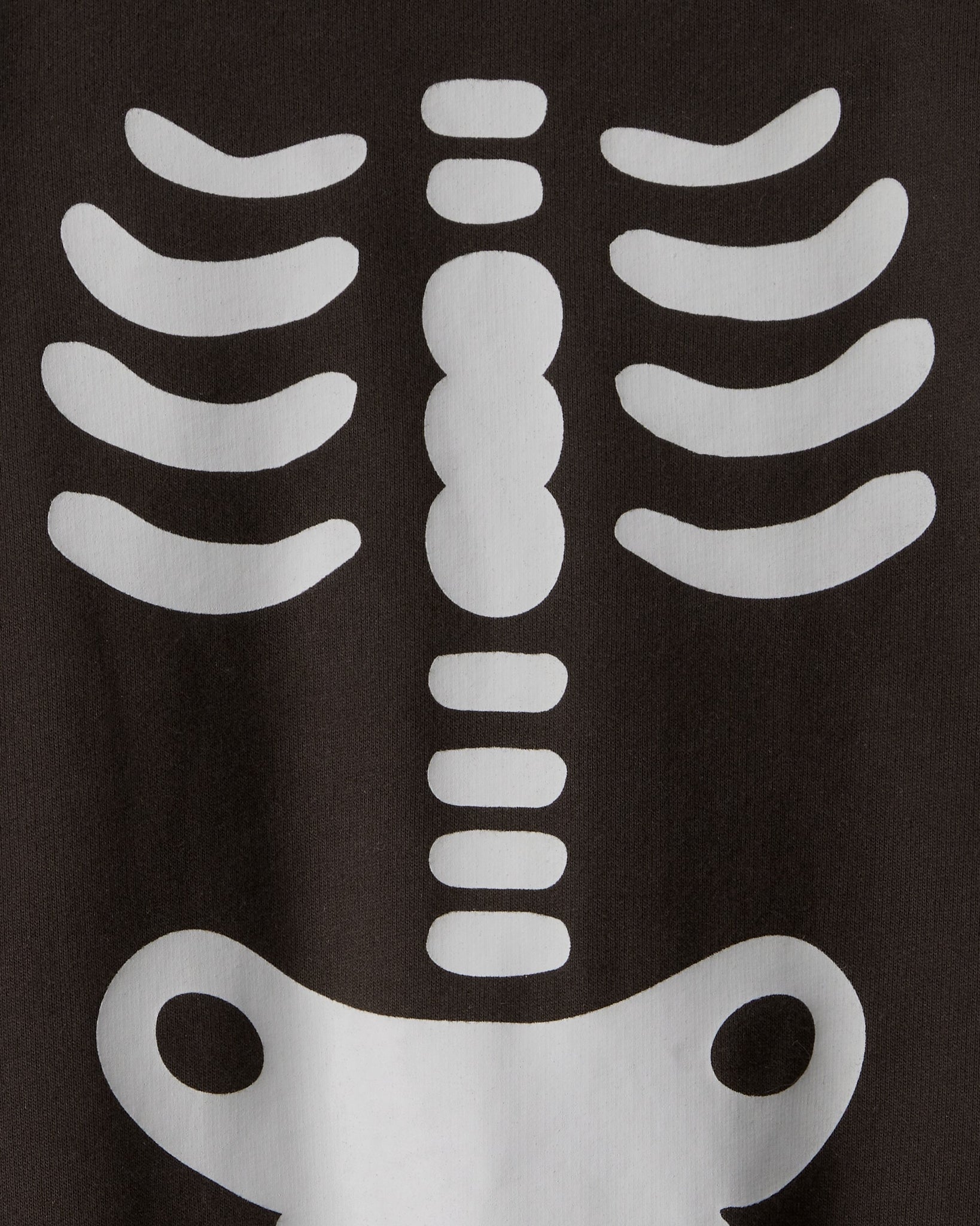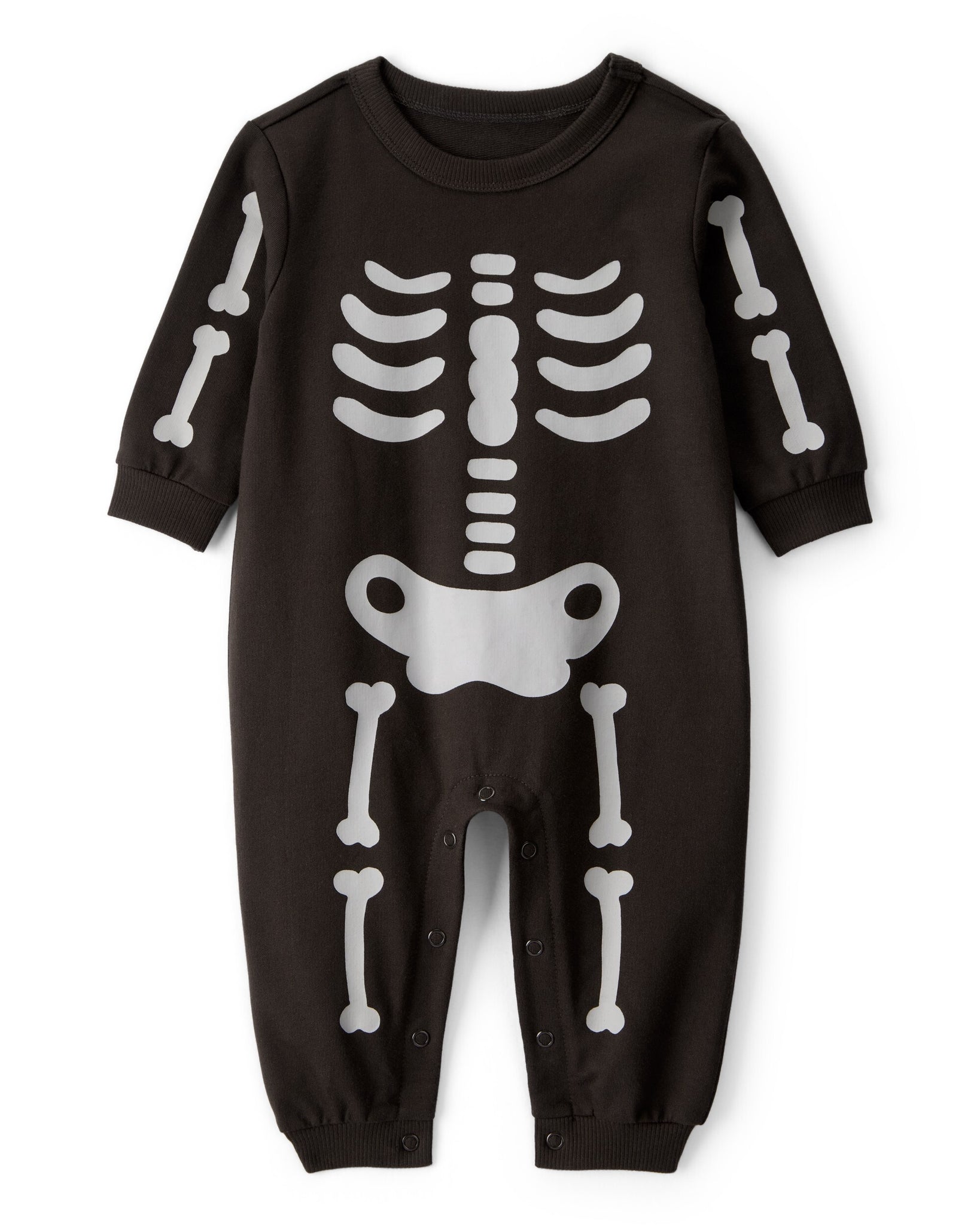 A playful nod to Halloween fun - minus the scratchy costume drama. This cotton French terry jumpsuit features a glow-in-the-dark skeleton graphic that’s equal parts cozy and creepy. With an easy crew neck and snaps at the bottom; it’s all treat and n