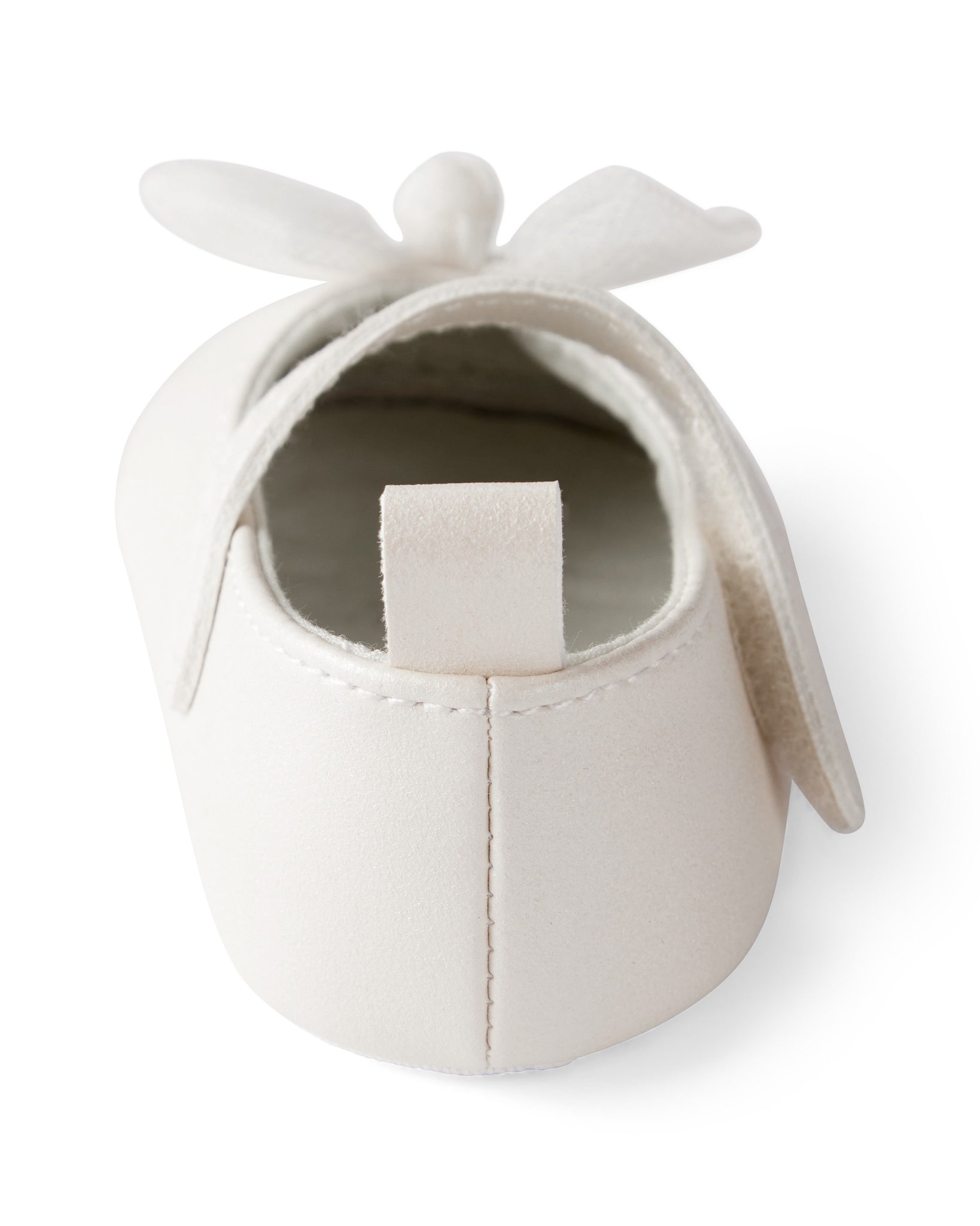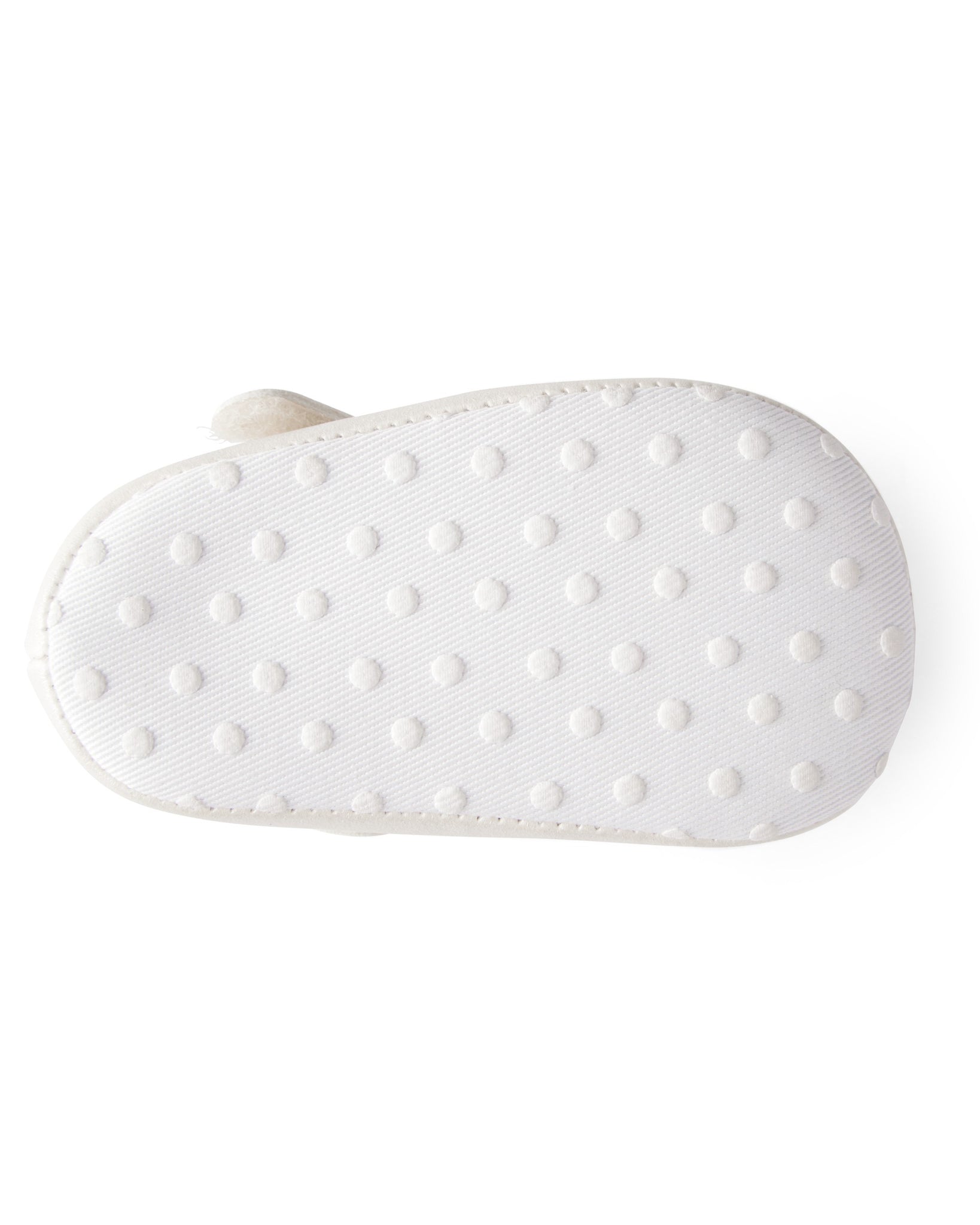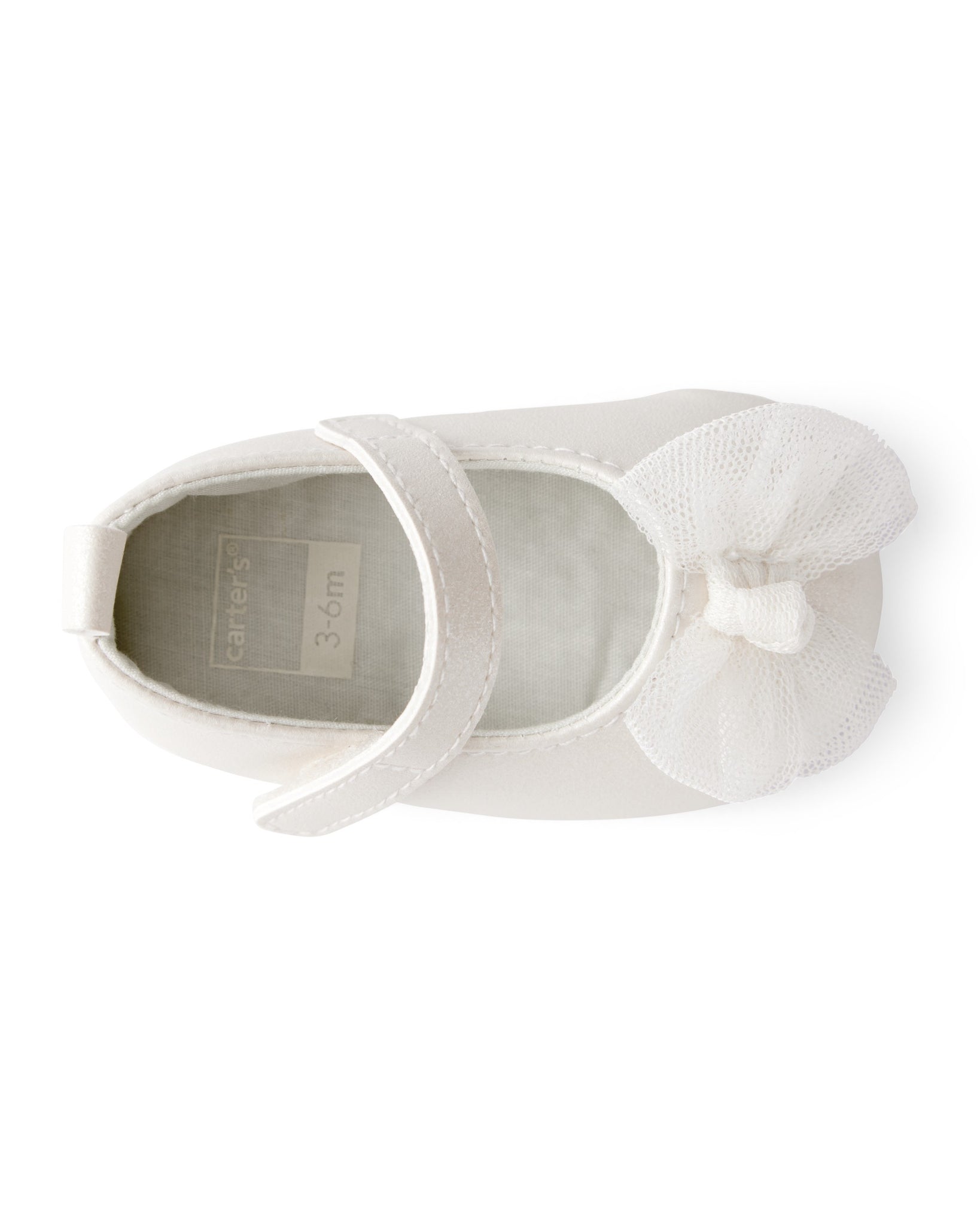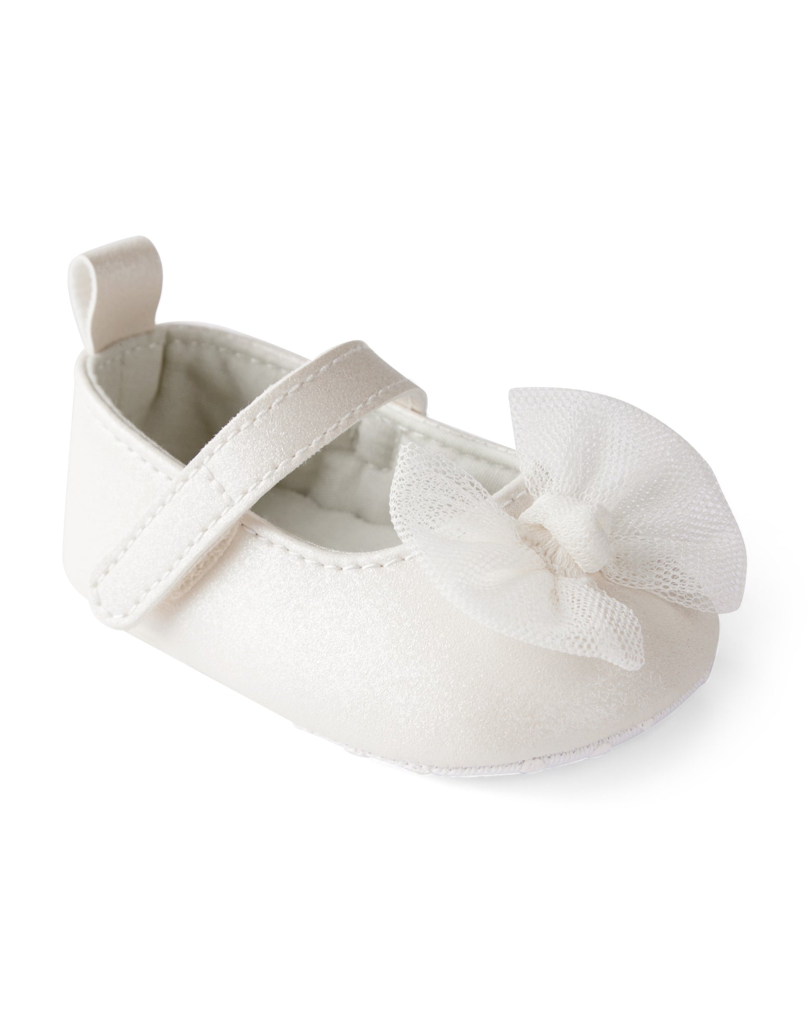 This not-so-basic ballet flat brings the sparkle with a soft shimmer finish and an oversized tulle bow up front. From day parties to family photos, it’s the kind of shoe that makes every outfit feel like a big moment - even if it’s just the third outfit change before noon. A stretchy Mary Jane strap keeps it snug through all the kicking, crawling, and toddling.