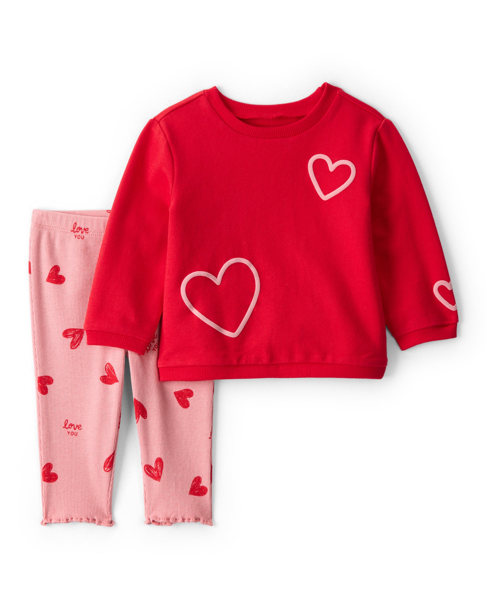 For the toddler who leads with heart-and maybe a little glitter. This 2-piece set pairs a red heart top with comfy pull-on pants covered in a mini heart print. The relaxed fit and tag-free design mean it’s comfy enough for all-day wear; from daycare to snack time. Sweet without trying too hard; and practical where it counts.